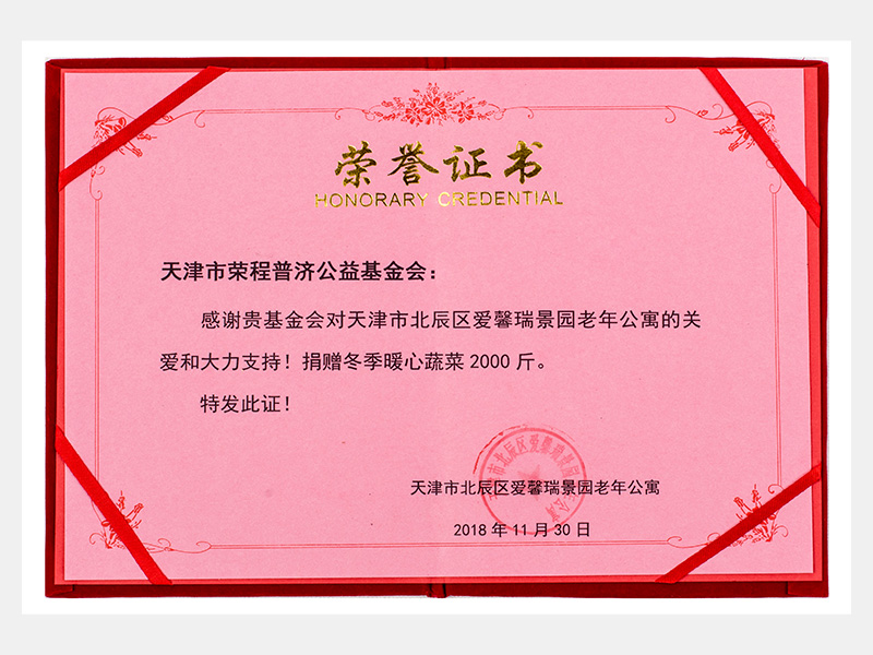 “購滯銷蔬菜捐贈養(yǎng)老院福利院活動”愛馨瑞景園老年公寓捐贈冬季暖心蔬菜2000斤榮譽證書(慈善)